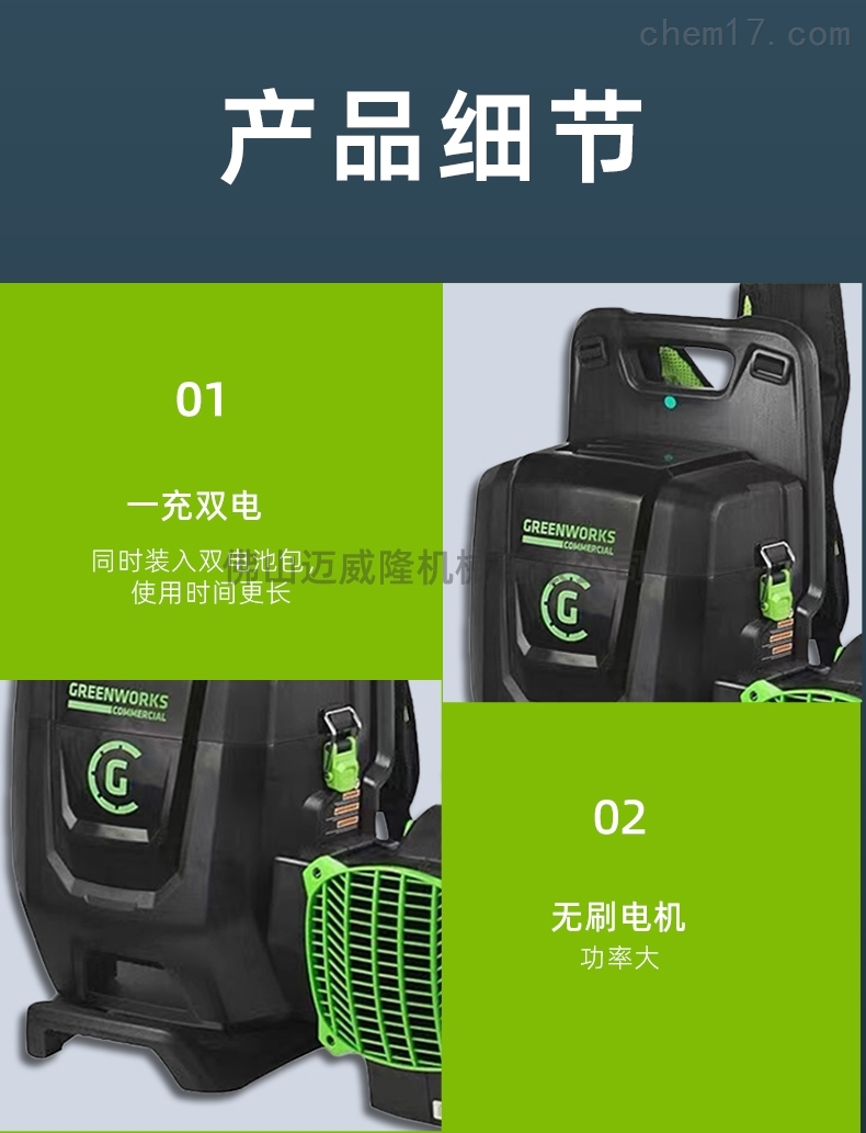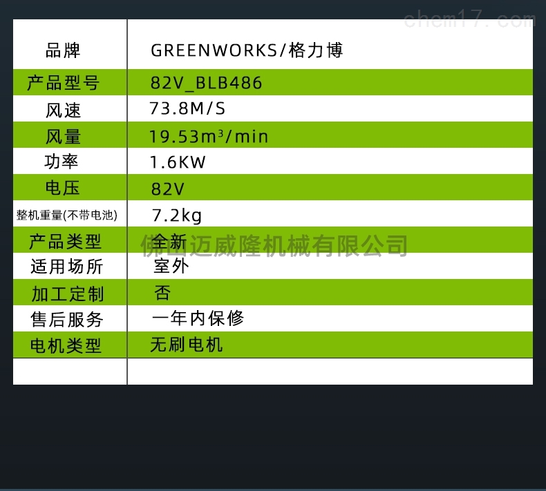Glibo 82v blb486雙電池吹風機產品參數:品牌:greenworks/Glibo產品型號:82v_blb486風速:73.8m/s風量:19.53m3/min功率:1.6kw電壓:82v整機重量(無電池):7.2kg產品類型:全新適用場所:戶外加工定制:無售后服務:一年內保修電機類型:無刷電機
